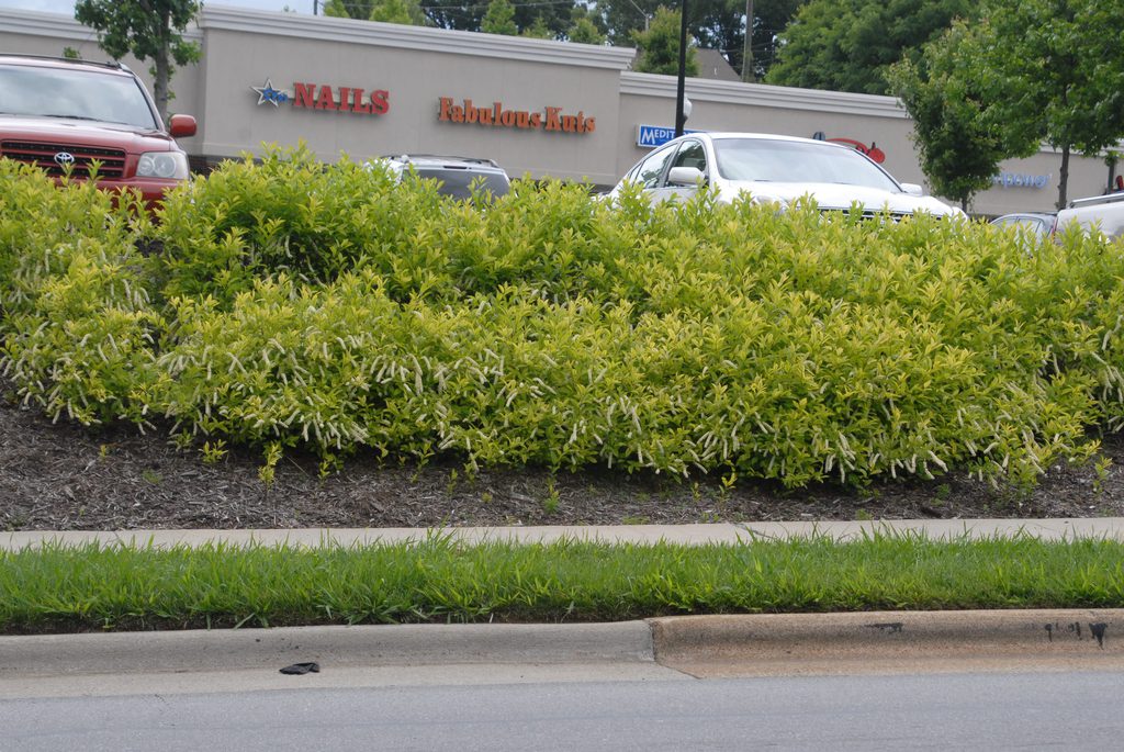 Virginia sweetspire is a native deciduous shrub with leaves that often persist into December (figure 50). It is found naturally along stream banks but can grow in drier conditions. Several cultivars are available, growing to various heights. It has attractive spring flowers produced along racemes. Virginia sweetspire can spread through suckers and is often planted as a hedge (figure 51). Flowers are produced on the previous season’s growth, so prune immediately after blooms are done, if desired. It tolerates a wide range of sun exposure, but blooms are best in full sun. Virginia sweetspire can grow from 3 to 9 feet tall, but most cultivars are on the shorter end of that range.