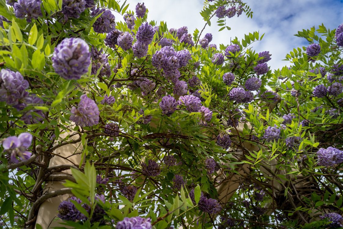 Invasive wisteria species from Asia (Wisteria sinensis and Wisteria floribunda) and their hybrids easily overtake native trees and landscapes. Fortunately, the native American wisteria offers many of the same ornamental features, though its inflorescence is smaller and it blooms later in the spring (figure 18). It prefers wet soils and flowers best in full sun, though it tolerates some shade. American wisteria can grow to 40 feet in length, but is usually much shorter and nowhere near as aggressive as its invasive counterparts. Grow on a trellis in rich, consistently moist soil (figure 19). American wisteria is a host plant for the silver-spotted skipper butterfly. It is harder to source than its invasive counterparts, so buy based on the botanical name from a reputable native plant supplier.