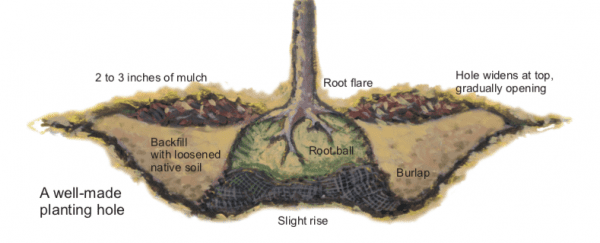 - Plant correctly. Consider the type of stock, planting hole depth and width, and mulch.