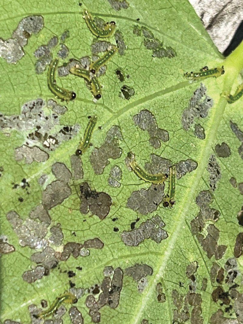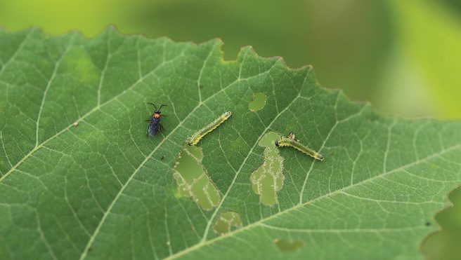 - Figure 4. Hibiscus sawflies, adult (left) and larvae (right). (Photo credit: John Olive, Auburn University, Bugwood.org)