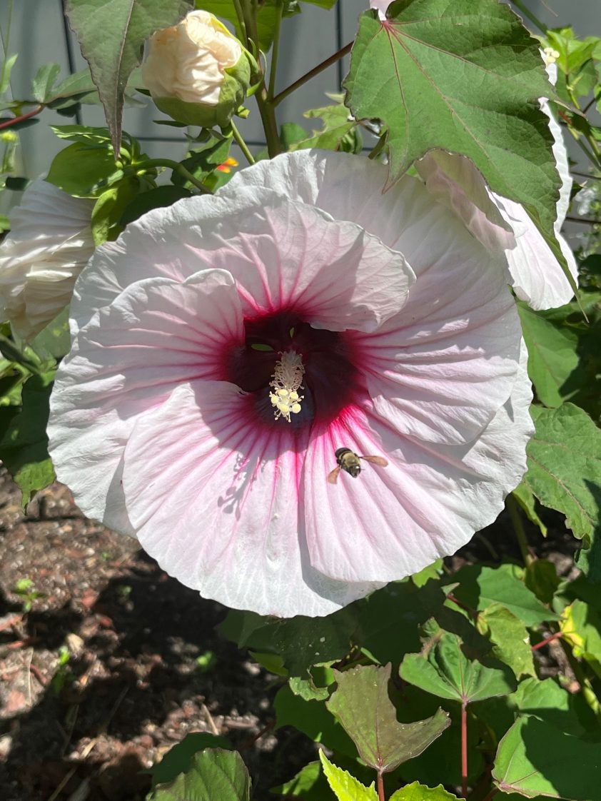 Unlike their tropical counterparts, hardy hibiscus, botanically known as Hibiscus moscheutos, is more cold hardy, vigorous, and long-lasting. They are fast-growing plants up to 8 feet tall and 4 to 6 feet wide and close relatives of the tropical hibiscus, but they have much larger flowers. The blooms, measuring 6 to 12 inches across, are impressive. Your neighbors’ heads will turn when they see these giant flowers. The hardy hibiscus plants are magnets for hummingbirds, butterflies, and bees, so much so that the rose-mallow bee (Ptilothrix bombiformis) uses the blossom during courtship. For more information on the rose-mallow bee, visit the United States Forest Service website.