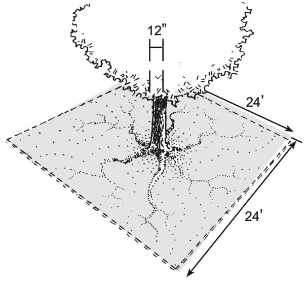 You want to create a design that will minimize root stresses. Some of these stresses may include soil compaction by pedestrians or cars, excessive heat reflecting off sidewalks or buildings, or an imbalance of water and air in the root zone. A good, quick rule of thumb for deciding the size of the planting area is to estimate the diameter of the tree at maturity. For each inch of diameter, allow 2 feet along the side of a square planting hole. For example, an oak that is 12 inches in diameter will need a protected root area of 24 feet on one side of the planting hole, or 576 square feet of rooting space.