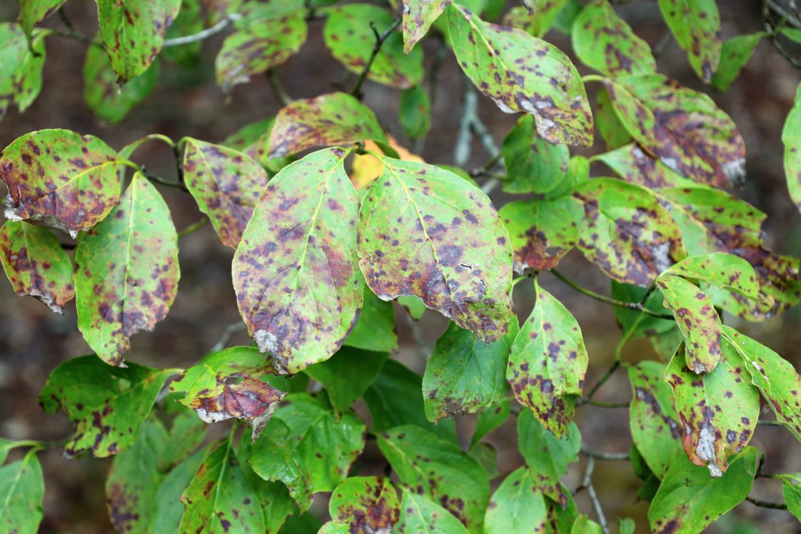 Jim Jacobi, an Alabama Extension plant pathologist, said the decline and death of dogwoods might be a combination of environmental conditions and diseases. Although it is a native species, flowering dogwoods are susceptible to several diseases, insect pests, and abiotic (nonliving) problems. Common diseases found on dogwoods in central Alabama are spot anthracnose, powdery mildew, and twig and branch cankers. Powdery mildew, which shows up as a white coating on the leaves, tends to be the most severe and widespread. Infections of this fungal disease cause a loss of water in the photosynthetic leaf area, which weakens trees and reduces growth. Under severe conditions, the new leaves can exhibit leaf scorch, twisting, distortion, and smaller-than-normal size. Older infected leaves often develop purple blotches that progress to dead areas.