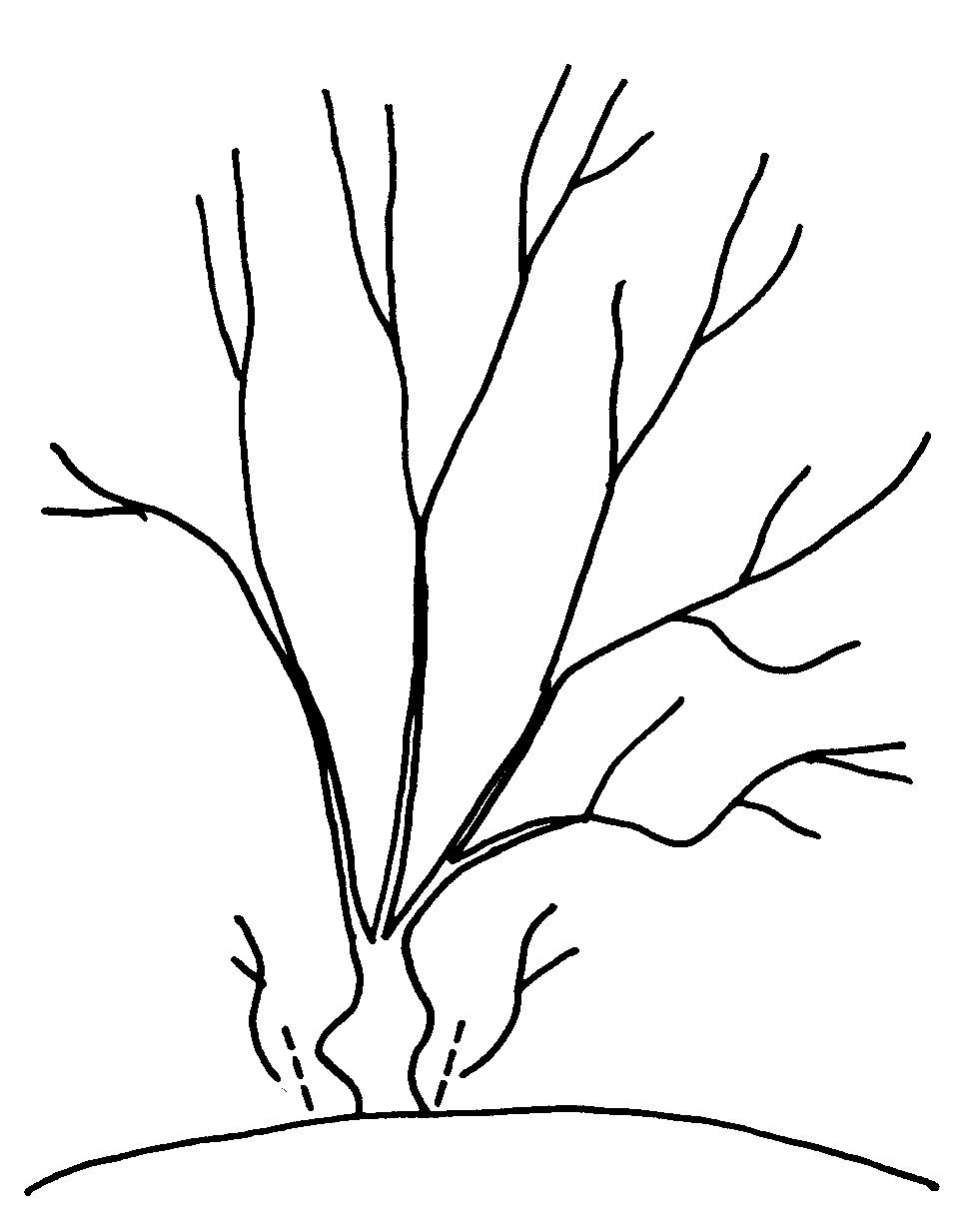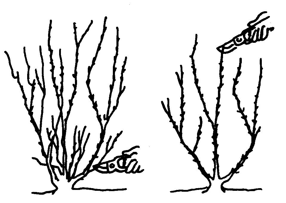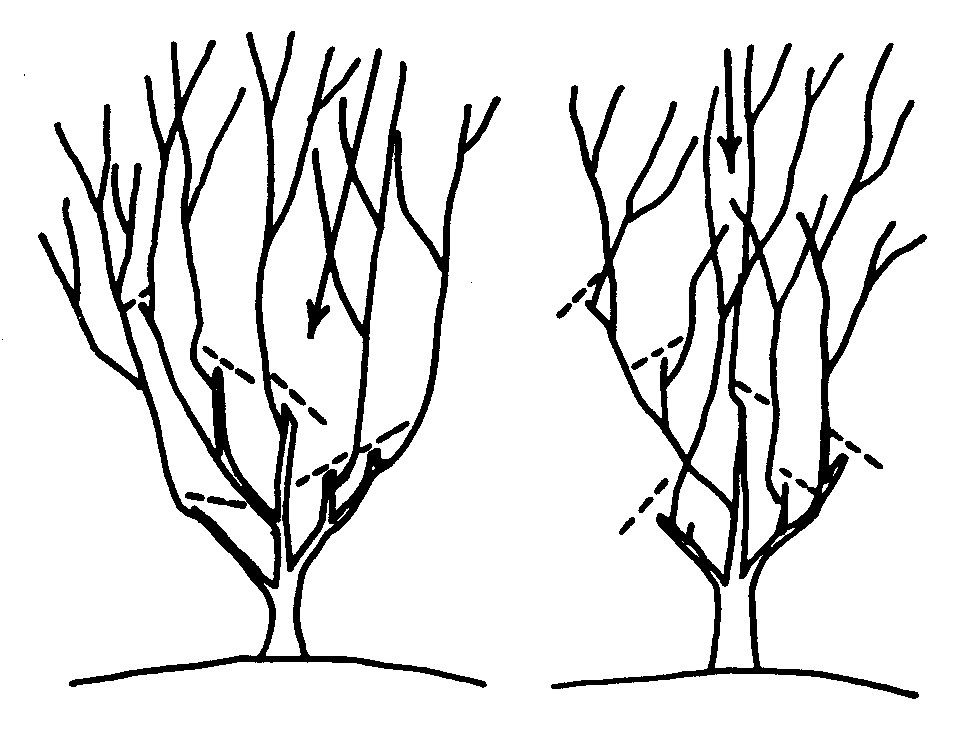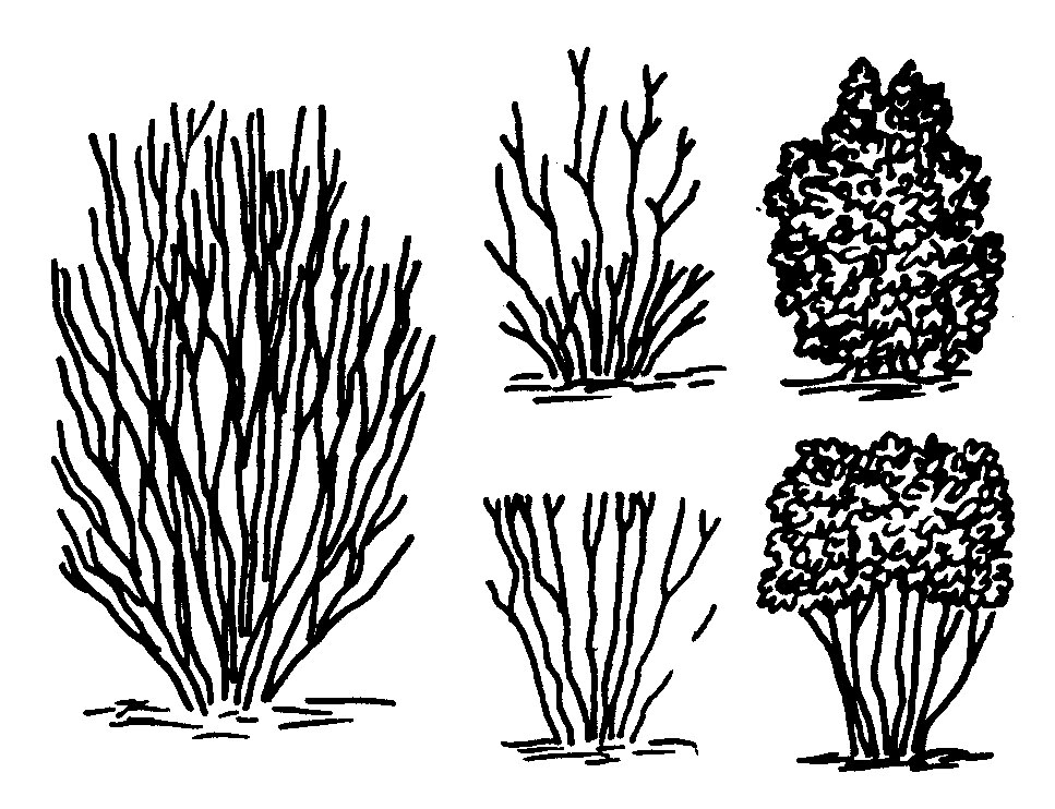 - When a multiple trunk, cane-type shrub needs pruning (left), remove one-third of the canes to the ground and cut one-third halfway to the ground to encourage new growth throughout the plant (upper figures). Pruning only the tops will result in new growth only at the top (lower figures).
