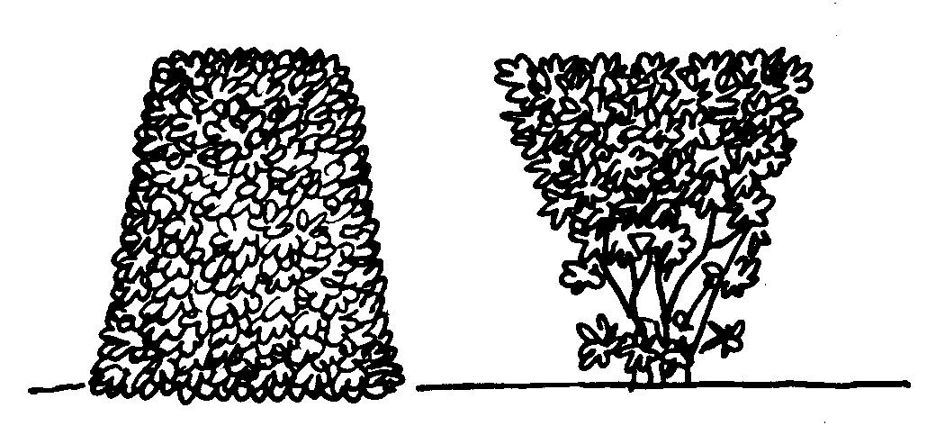 - To maintain a formal hedge, the sides must be sloped slightly to make the top narrower than the bottom (left). Pruning the side vertically will shade the lower leaves and result in leggy growth (right).