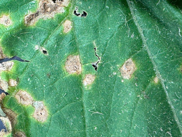 Symptoms are most noticeable on older leaves as tan to dark brown and somewhat circular spots. The spots may merge resulting in blighting, distortion, and death of entire leaves. The dry, dead centers of old lesions often crack and tear, giving infected leaves a ragged appearance. Lesions that are elongated and sunken can also develop on petioles and stems of plants which can result in the death of developing fruit. Older fruit can also be infected with symptoms appearing as circular, sunken, dark green to black lesions.