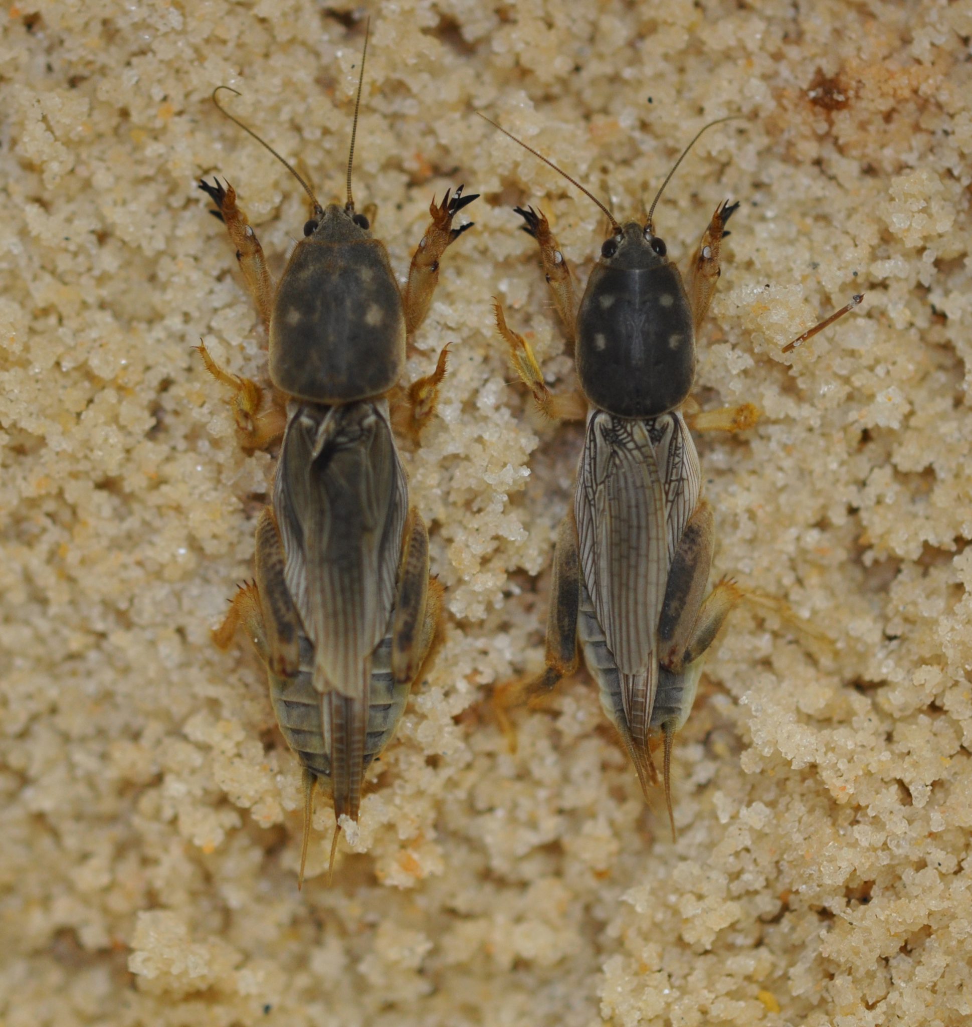 - Figure 3. The southern mole crickets are grayish with four pale dots on the pronotum.