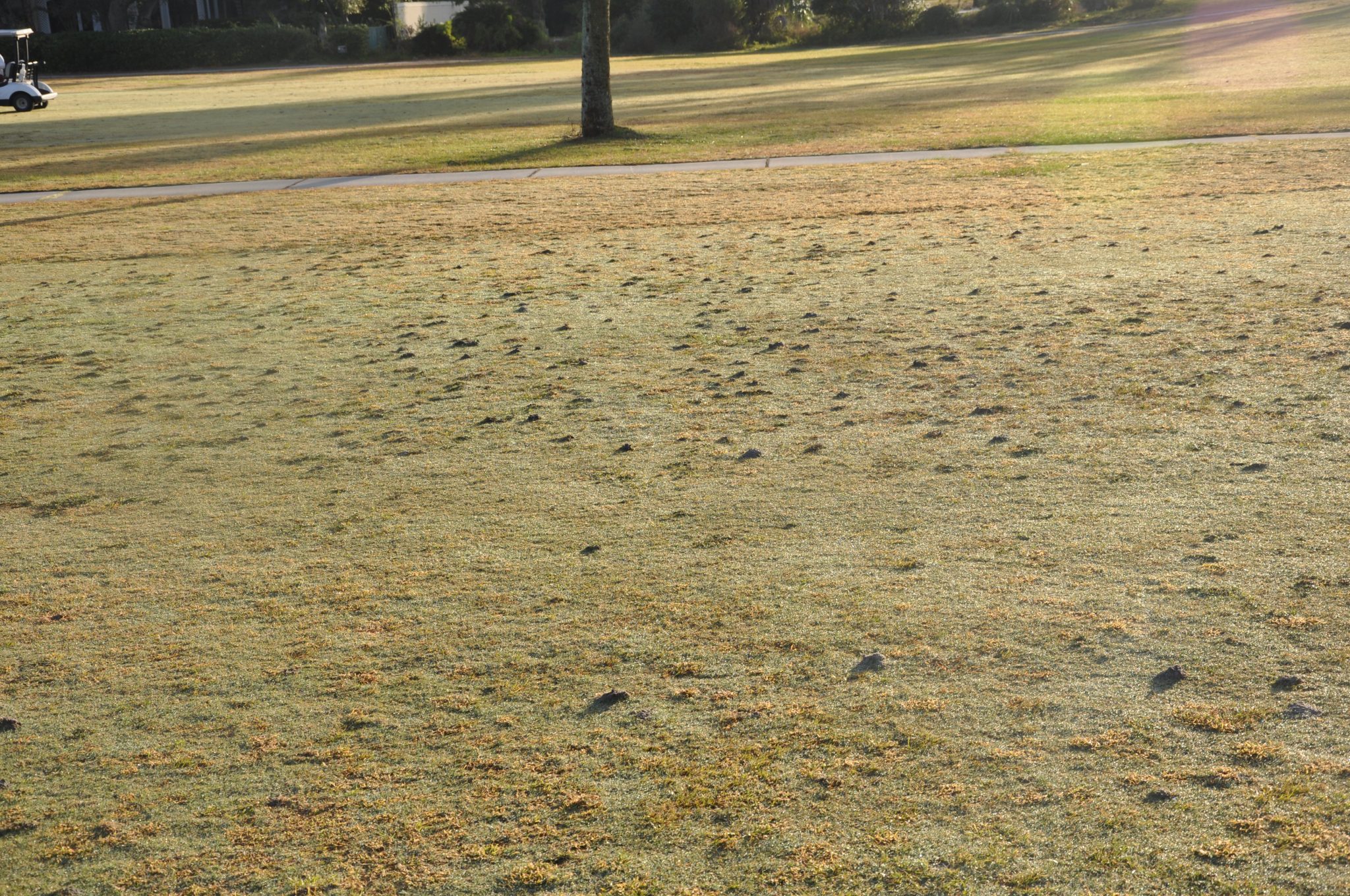Belowground tunnels erupt to the surface causing numerous small mounds of soil (Figure 12). Tunneling increases as the season progresses. When combined with feeding, extensive tunneling can result in desiccation and susceptibility to other types of damage from foot traffic, golf carts, drought, or possibly pathogens such as Rhizoctonia root rot. Mole crickets feed on grass roots but also feed at night at the surface on grass blades or other insects. Surface- feeding behaviors are the basis for the use of baits discussed later.