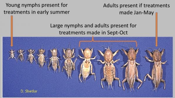 Figure 6. Mole cricket development begins at egg hatch in early summer and is not completed until the insects mature in the spring of the following year. (Image credit: D. Shetlar, The Ohio State University)