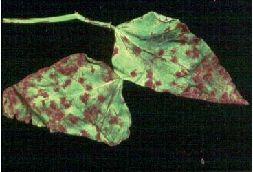 - Figure 7. Reddish-purple leaf lesions caused by bean anthracnose