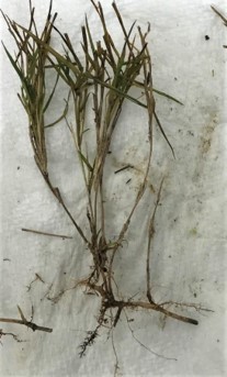 Roots on stolons collected from turf damaged by SDS and bermudagrass decline are withered, dark brown to black in color, and brittle. Few thick, white, healthy roots are seen on diseased bermudagrass stolons (figure 3).