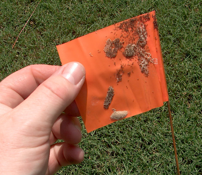 If wasps or birds are present, inspect the turf for larvae or use a soap flush. If no larvae are visible on the grass, look in the turf for green pellets of frass (larval excrement) and larvae. Some larvae may also be overcome by fire ants (Figure 8). Soap flushes can be used to bring larvae to the top of the turf (Figure 9). To do a soap flush, mix 2 tablespoons of liquid dishwashing soap in 1 gallon of water. Using a watering can, pour the soapy water over a 1- to 2-square-foot area. The larvae, if present, will emerge from the soil or thatch. This technique may also cause other insects (sod webworms, other armyworms, mole crickets) to come to the surface.