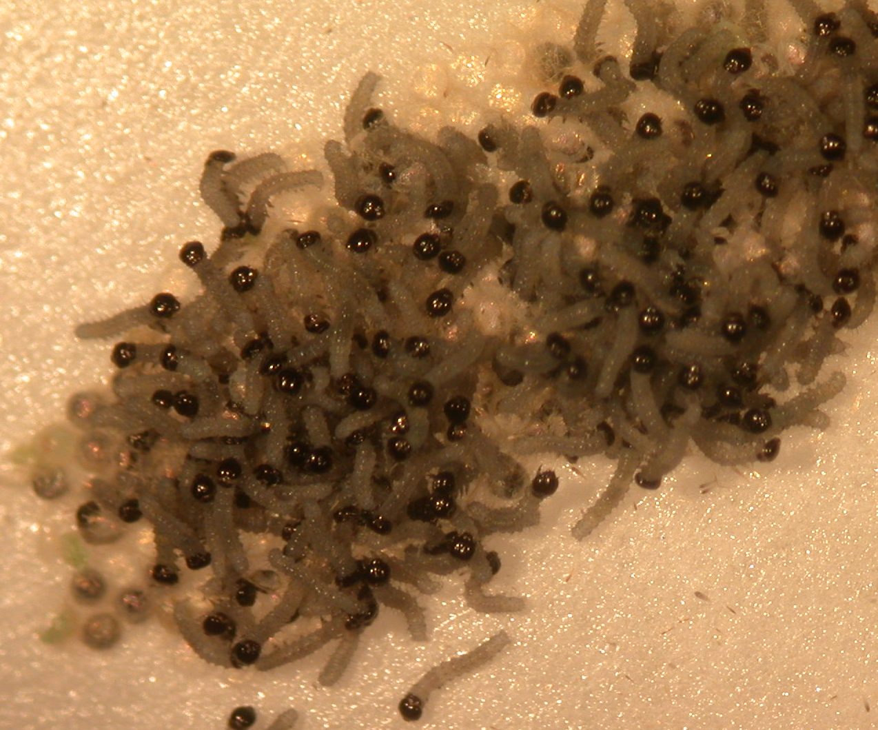 - Figure 4. Tiny, light-colored, black-headed larvae spin down to the turf on silken webs.