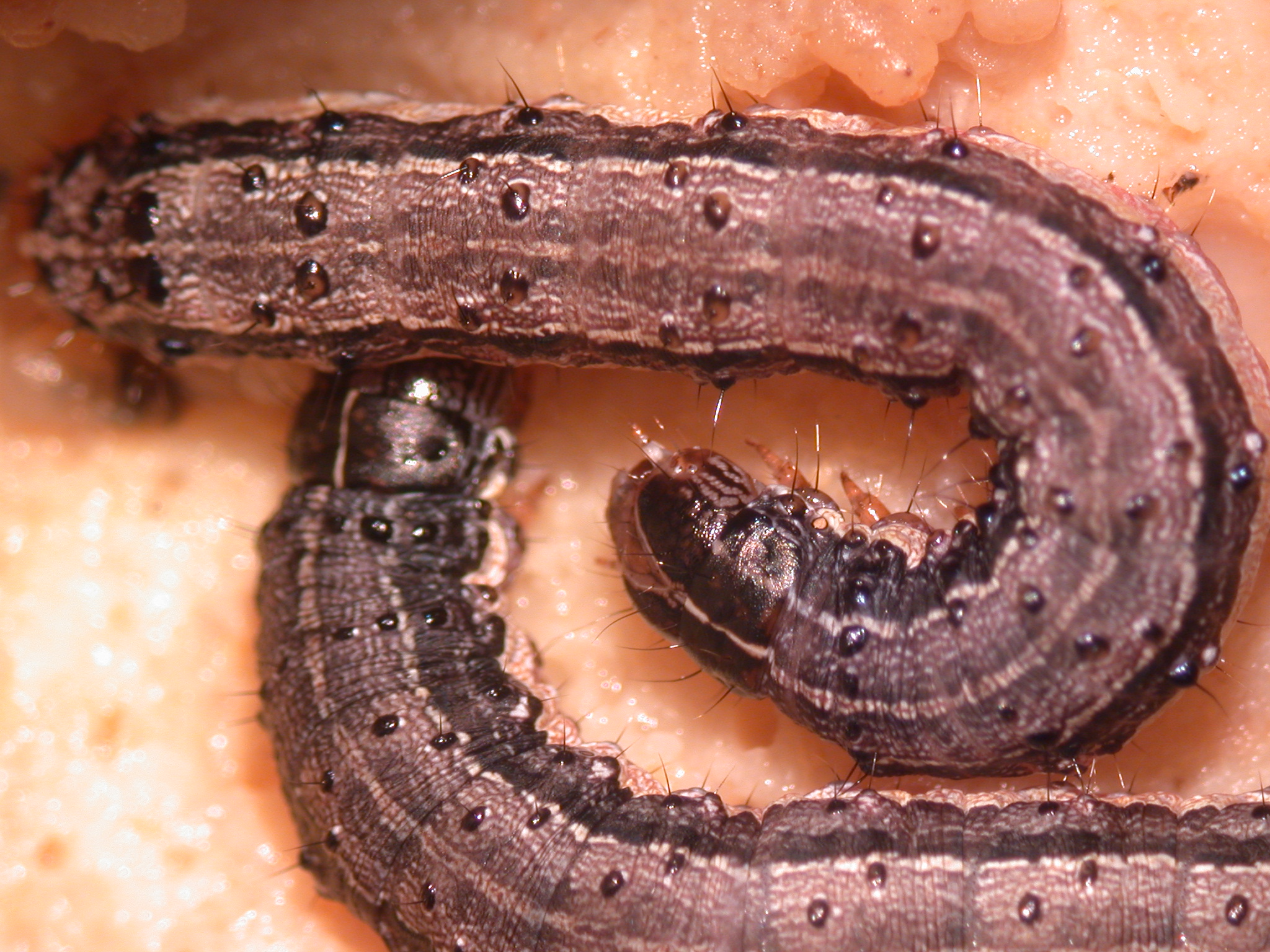 Development from egg to fully grown larva requires about 2 to 3 weeks. At this point, larvae burrow into the soil and form pupae from which moths emerge in about 10 to 14 days. Because development can be 2 to 4 weeks, it is possible to have four or more generations per year. Overwintering occurs in the pupal stage, but this stage cannot survive the winter in Alabama. Fall armyworms are permanent residents of Central and South America and the extreme southern parts of Texas and Florida. Populations that overwinter in southern Florida and Texas are the primary sources for fall armyworms in Alabama and the rest of North America. The fall armyworm moths, carried by air currents, make their way from Texas or Florida to Alabama each year. Trapping suggests that the arrival of moths in central Alabama is in April or May, but the first moth capture can vary as much as one month between years.