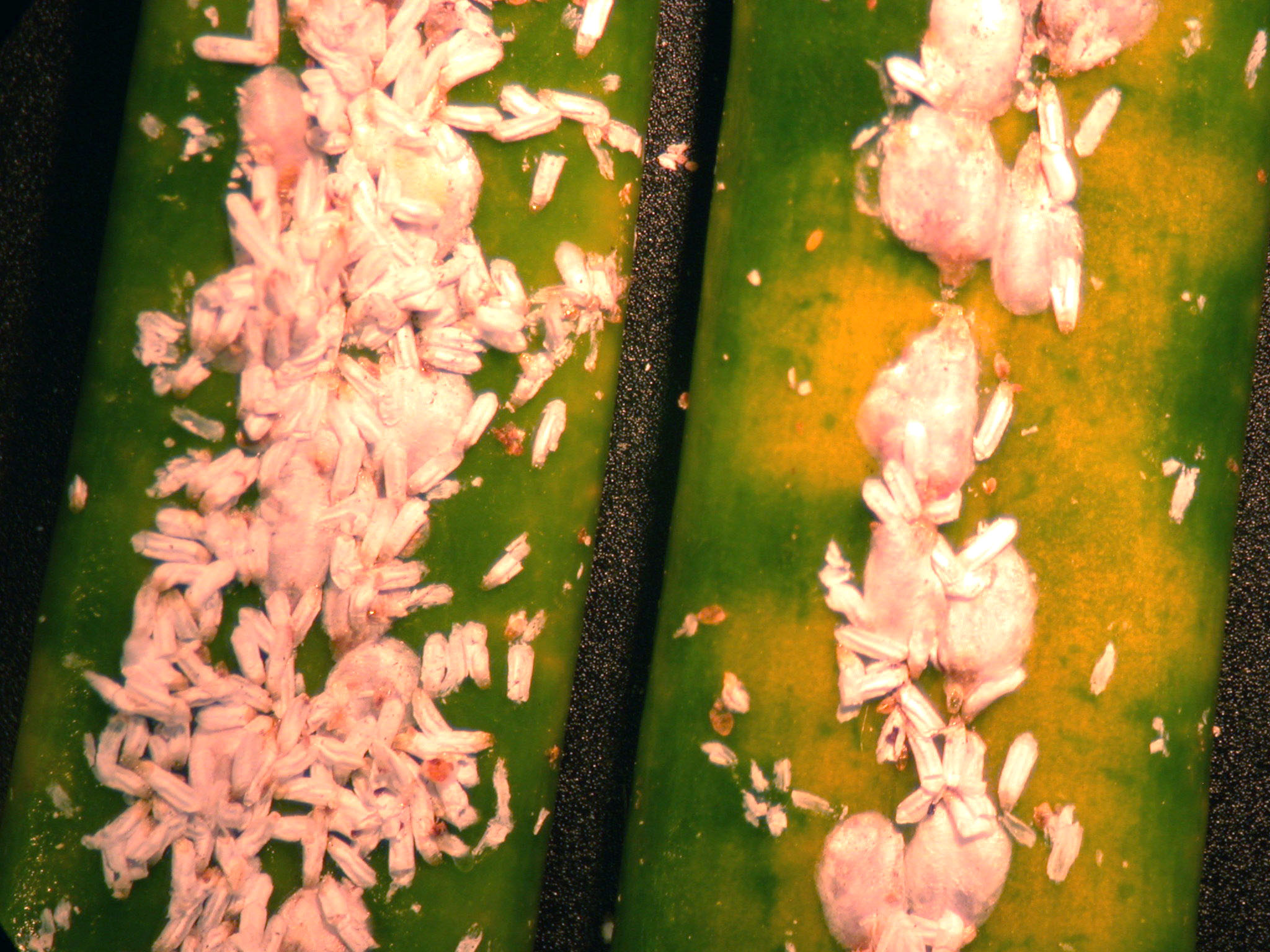 Newly hatched nymphs are called crawlers (figure 3), because this is typically a mobile, dispersing stage for most species. Crawlers may stay on the same plant or be dispersed by animals, other insects, or wind to adjacent plants. They do not have a waxy coating at this point and are more susceptible to natural enemies and insecticides.
