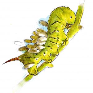 Female wasps lay eggs under hornworm skin. Larvae eat their way out of the caterpillar to spin their cocoons on its back.