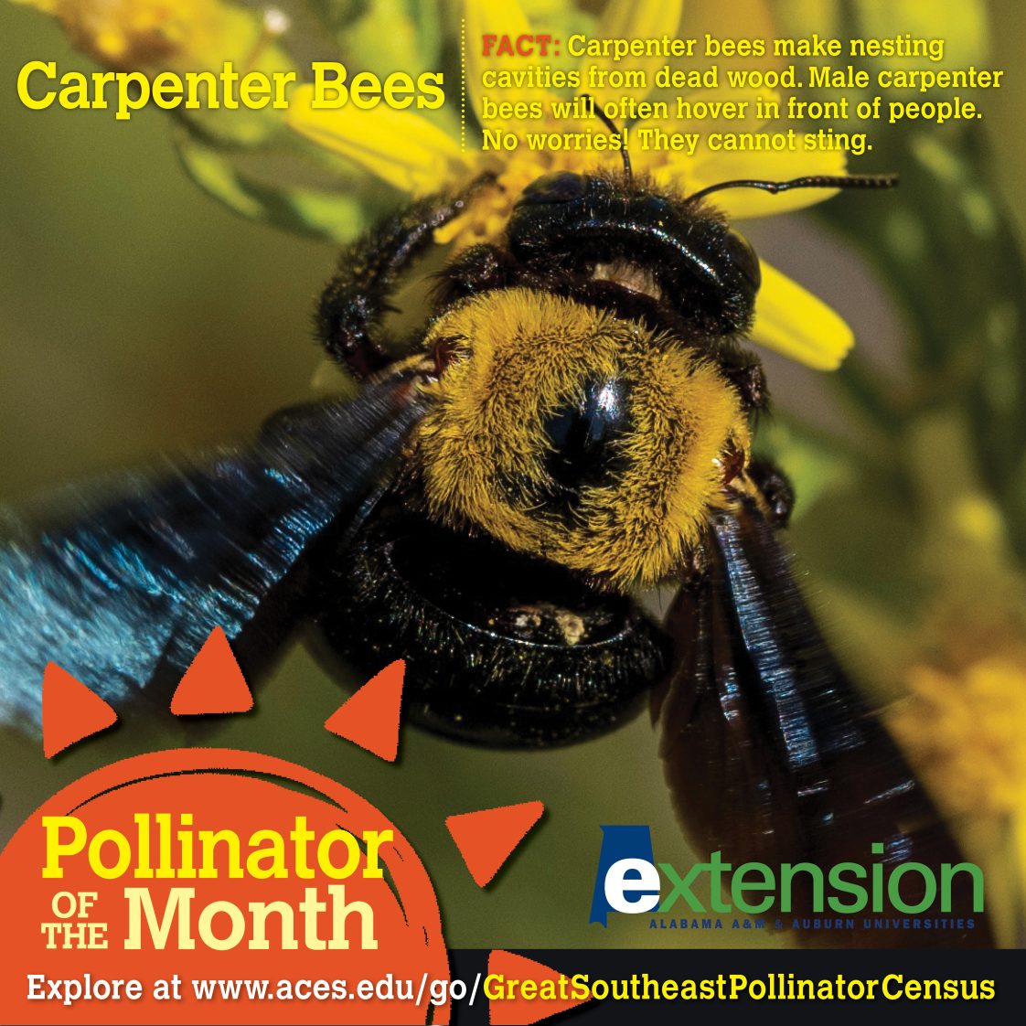 FACT: Carpenter bees make nesting cavities from dead wood. Male carpenter bees will often hover in front of people. No worries! They cannot sting
