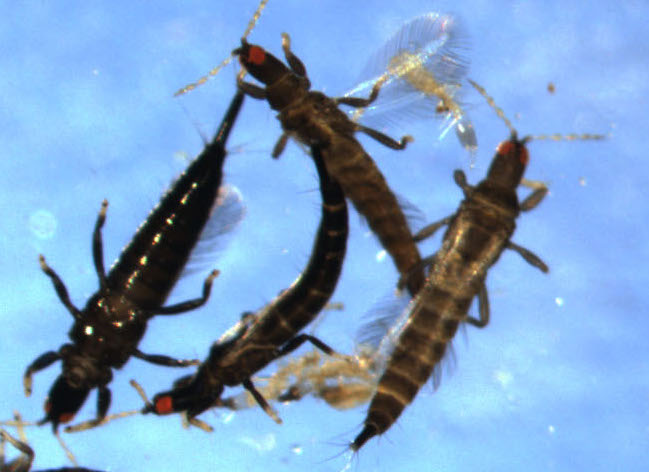 When eggs hatch, the immature thrips wriggle out of the hole and begin to feed. The first two life stages are called larvae stages and resemble adult thrips but much smaller and without wings. The next two stages are named pupal stages because they do not feed. Both pupal stages have obvious developing wings (wing pads) that give them a different appearance than larval stages (figure 6). It is common for the pupal stages to drop from the plant leaves or flowers and complete development in the soil or leaf debris below the plants. Adult thrips will then emerge from the soil and debris and find new hosts for feeding and egg laying.