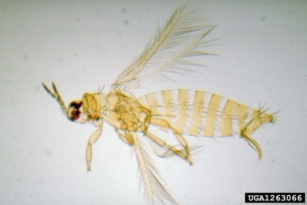 Thrips are unique insects assigned their own order (Thysanoptera). This order is named for the fringed wings found on adult stages. Figure 1 shows these wings as small, narrow, and surrounded by tiny hairs. Thrips are one of the smallest orders of insects. Most are slightly more than 1/32 inch (1 mm) in length, which is about the width of the tip of a sharpened pencil. They can be seen with the naked eye, but magnification is required for identification to insect order. Thrips are a major pest species of ornamental plants and cause damage through their rasping/sucking mouthparts used to consume plant sap. Thrips can be difficult to manage because they develop quickly. Many species can complete a generation in just 2 weeks.
