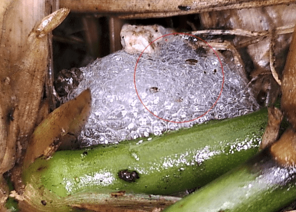 Spittle mass created by spittlebug nymphs on St. Augustine grass.