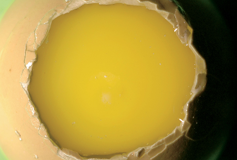 - Infertile, unincubated egg. Blastodisc located on top of yolk appears irregular in shape.