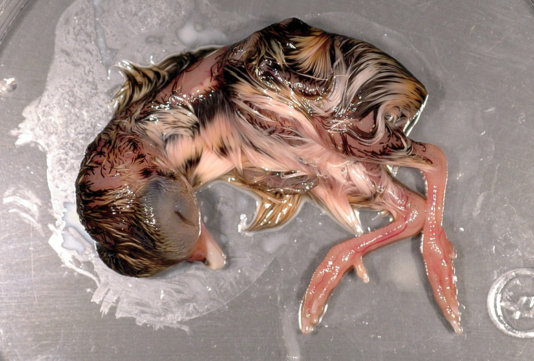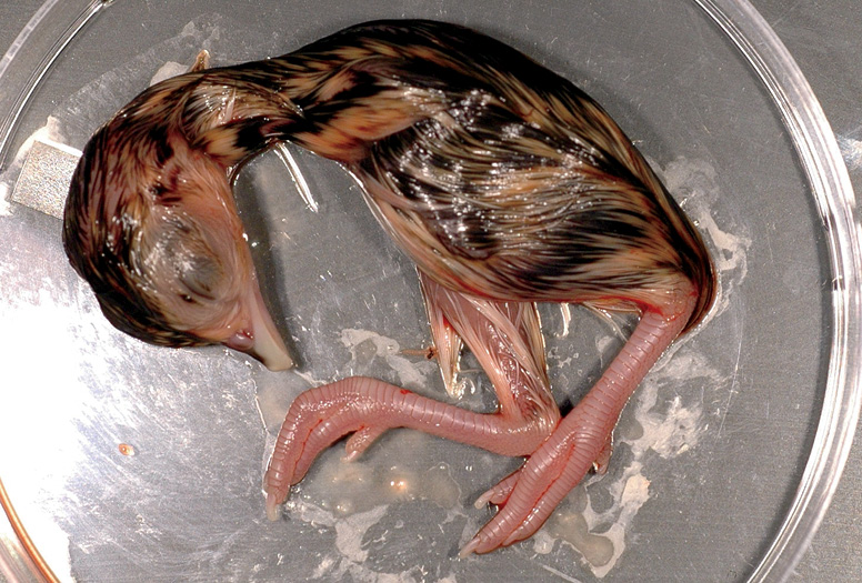 - Day 18 Calcification of bone started. Toenails and down feathers on neck, thighs and wings present.