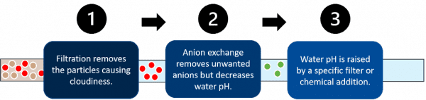 1. Filtration removes the particles causing cloudiness. 2. Anion exchange removes unwanted anions but decreases water pH. 3. Water pH is raised by a specific filter or chemical addition.
