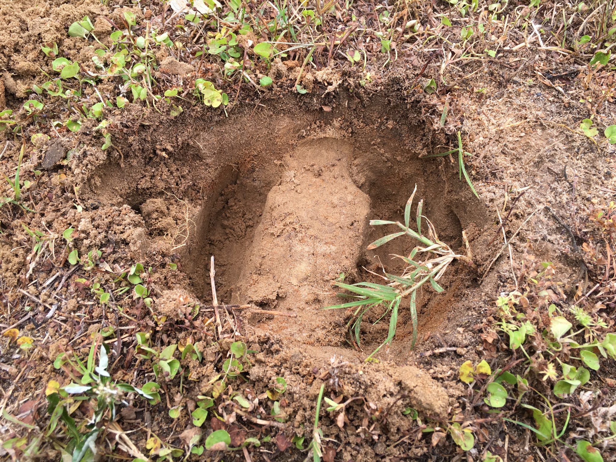 When setting scissor-jawed or choker traps, dig out a portion of soil around the tunnel and place the trap in the hole (figs. 7, 8, and 9). Fill the hole back in with the soil (fig. 10), making sure no light penetrates into the tunnel. It is recommended that you wear rubber or latex gloves to prevent your scent from getting on the trap. After setting the trap, be sure not to walk on or disturb other portions of the tunnels.